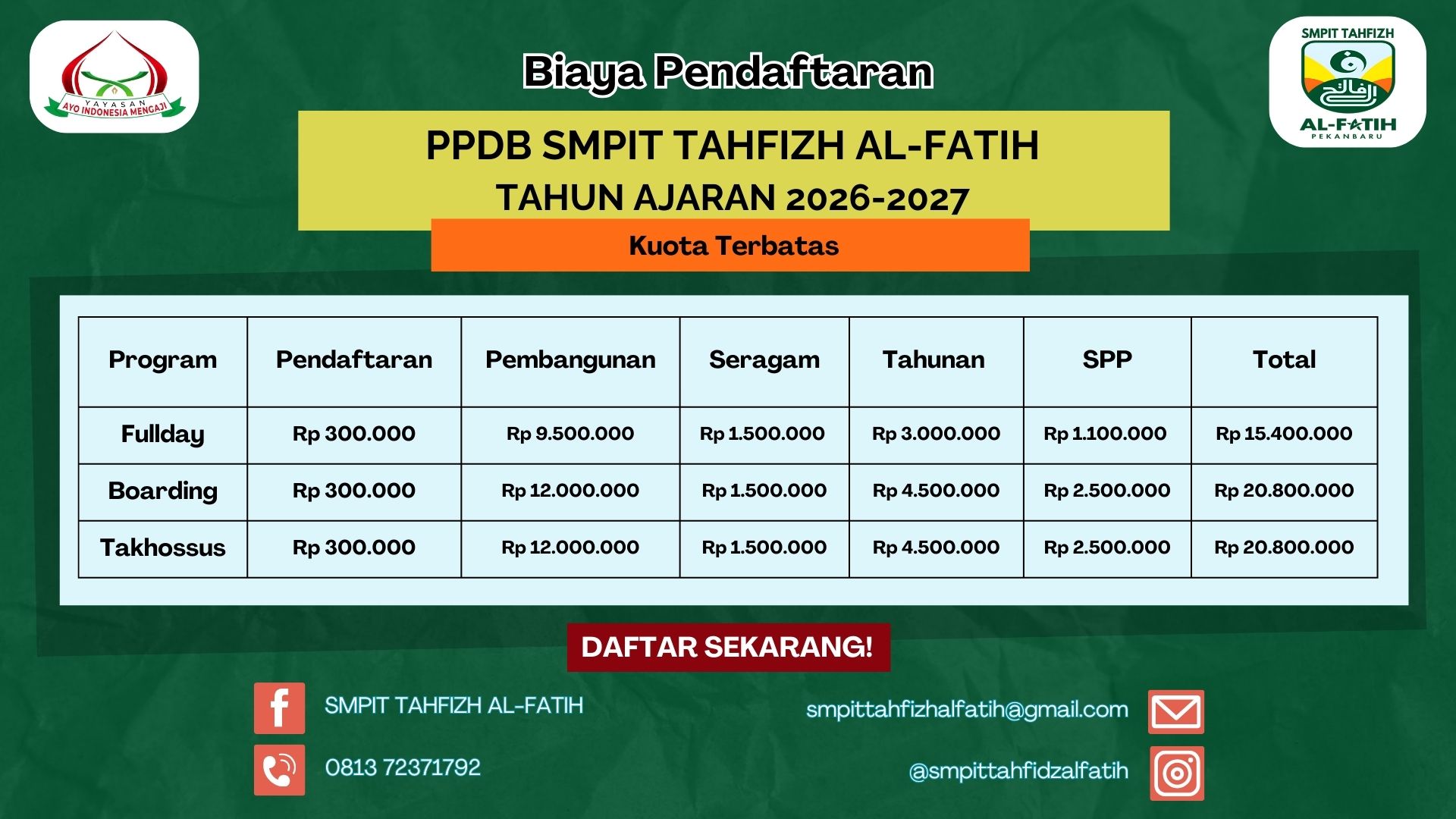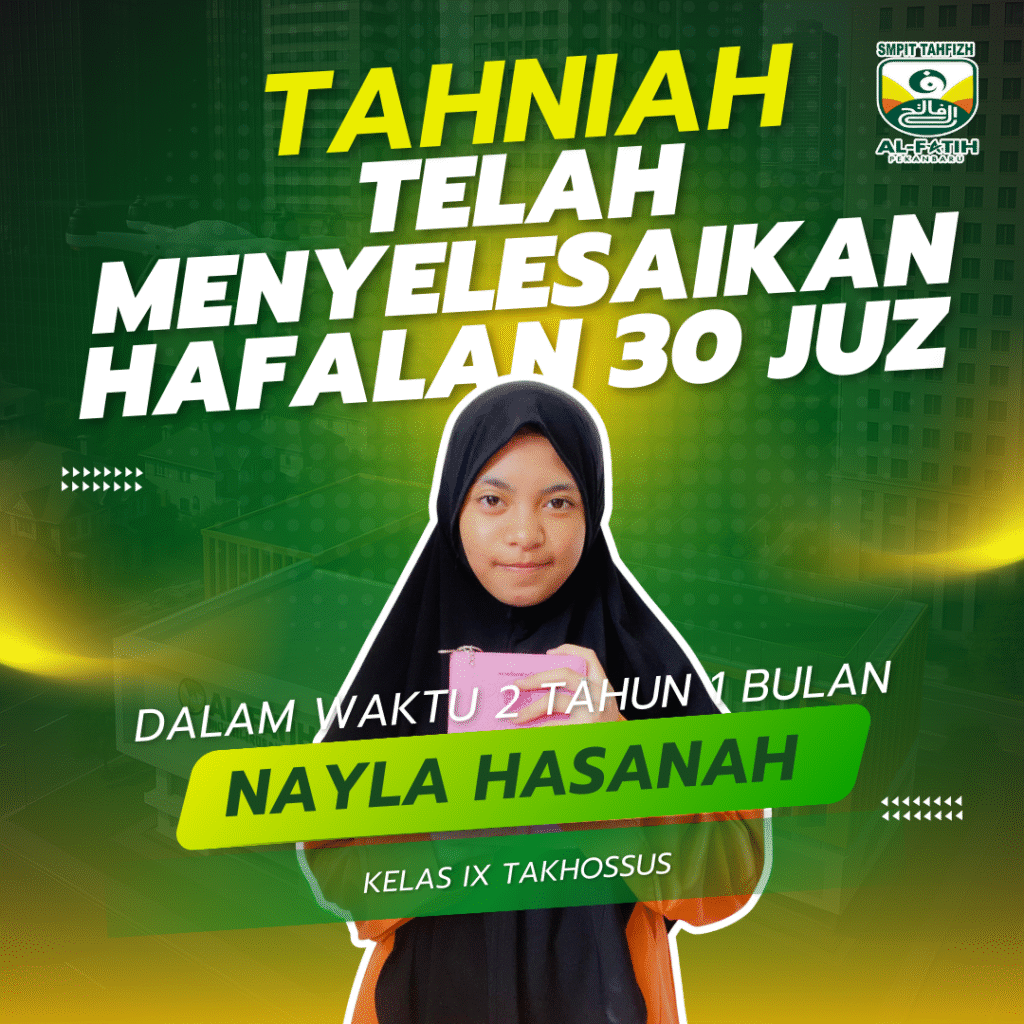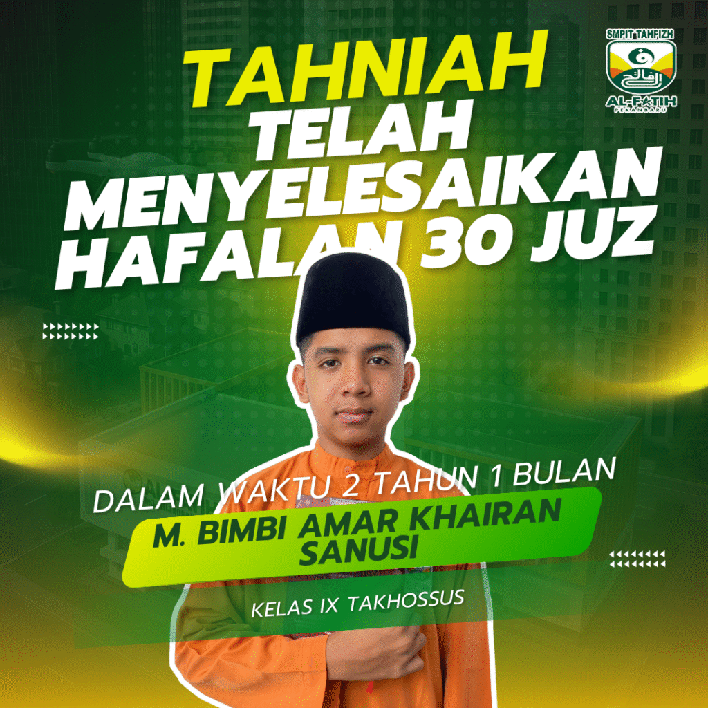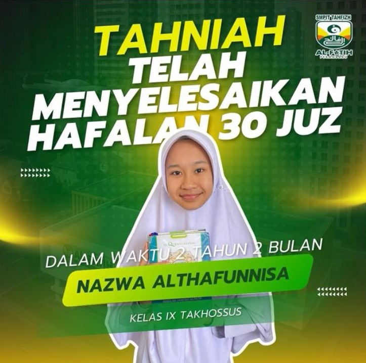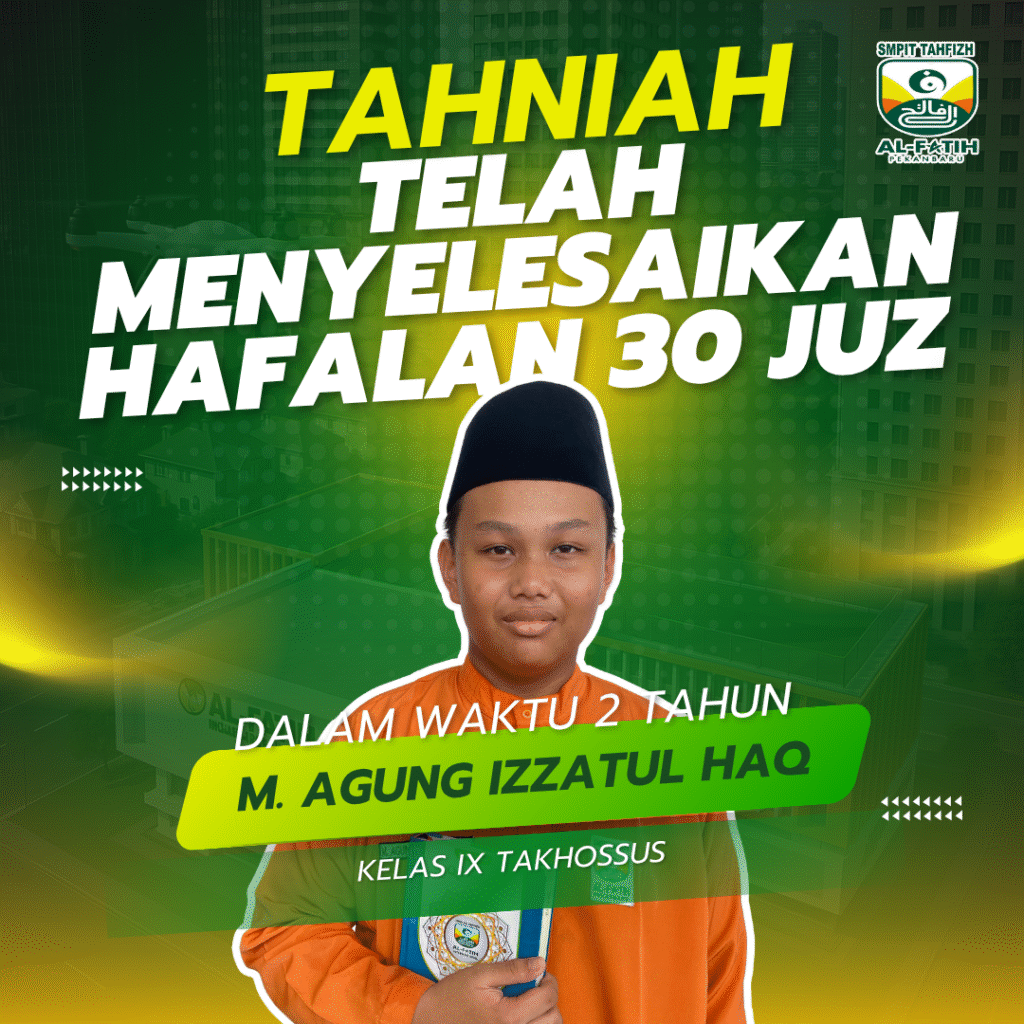 SMPIT Tahfizh Al Fatih adalah tempat yang tepat untuk mewujudkan anak Anda agar dapat tumbuh menjadi generasi yang cerdas, berakhlak mulia, dan mencintai Al-Quran. Kami memberikan pendidikan formal dan nonformal dengan target tahfizh hingga 30 juz, dilengkapi dengan pembinaan akhlak dan adab yang kuat.Β