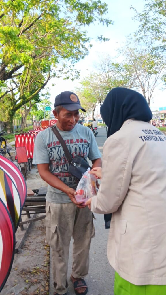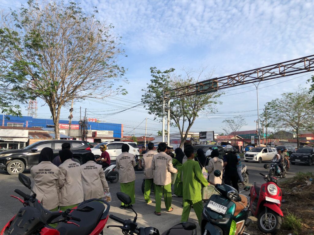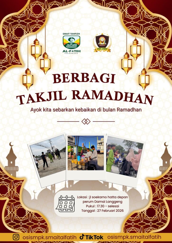 Pekanbaru, 27 Februari 2026 – Dalam rangka menyemarakkan bulan suci Ramadan, OSIS SMAIT Tahfizh Al-Fatih Pekanbaru menggelar kegiatan pembagian takjil kepada masyarakat pada Jumat (27/2/2026). Kegiatan ini dilaksanakan di lampu merah Simpang Arengka, Pekanbaru. Kegiatan sosial ini melibatkan seluruh pengurus OSIS beserta beberapa guru pendamping. Sejak pukul 16.30 WIB, para siswa telah berkumpul untuk membagikan ratusan paket takjil kepada para pengendara motor, mobil, serta masyarakat sekitar yang melintas menjelang waktu berbuka puasa.